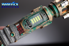 The exposed sections of metal on the props were made primarily from brass, contrasting from the aluminium that was mainly used on The Doctor’s Sonic at the time. Large grey crackle paint adorned the handle and the whole prop was weathered with a Verdigris effect, which was created by layering and mixing together several different colours of acrylic paint.